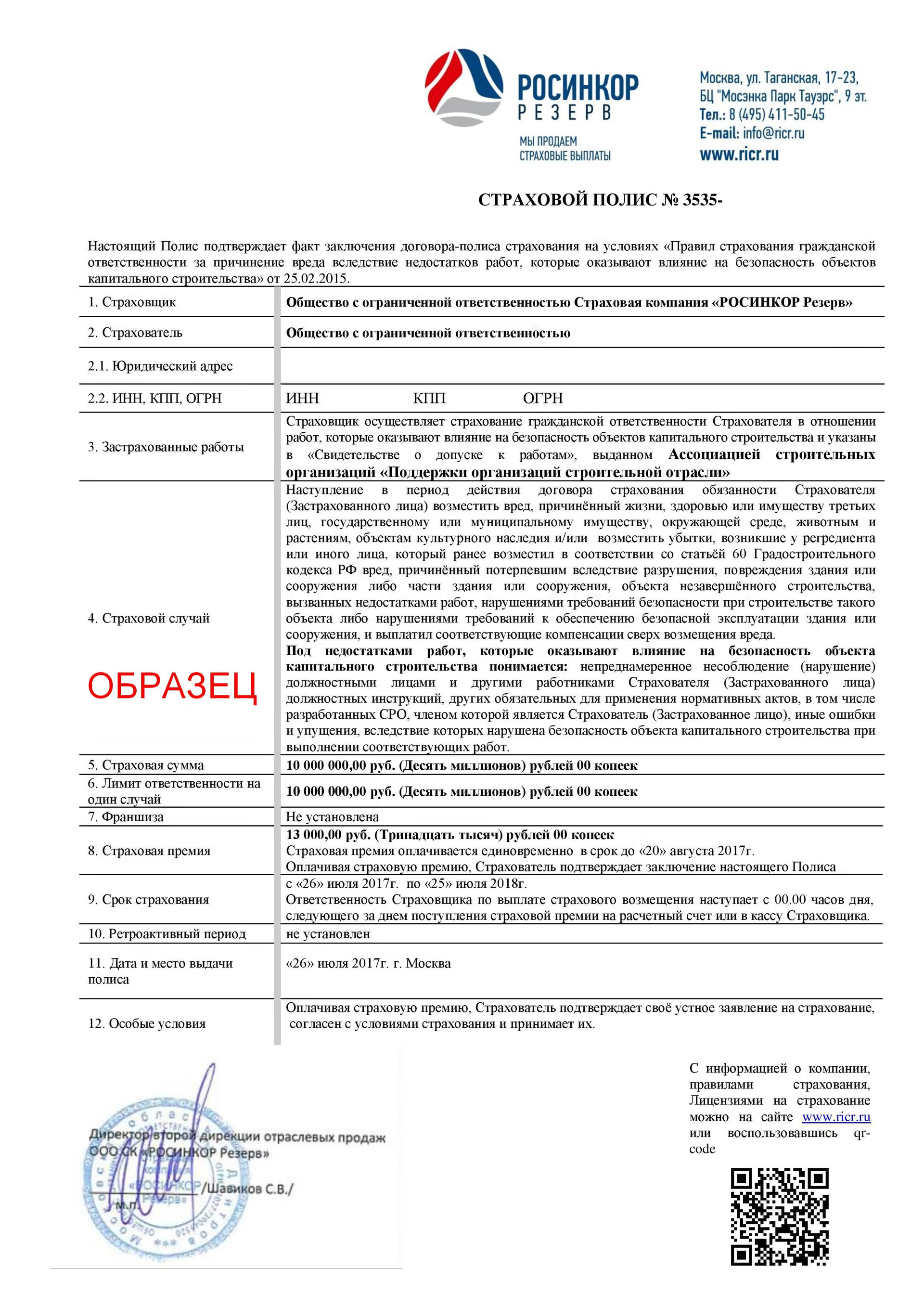 - В отдельных СРО: договор страхования гражданской ответственности.